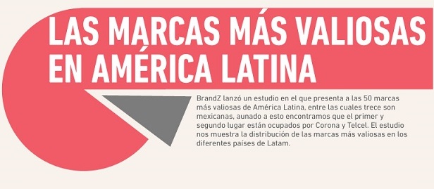 BrandZ ha publicado un interesante informe en el que recopila las 50 marcas más valiosas de América Latina. El primer puesto del top lo ocupa la marca Corona (México) seguida por Telcel (México) y Skol (Brasil).